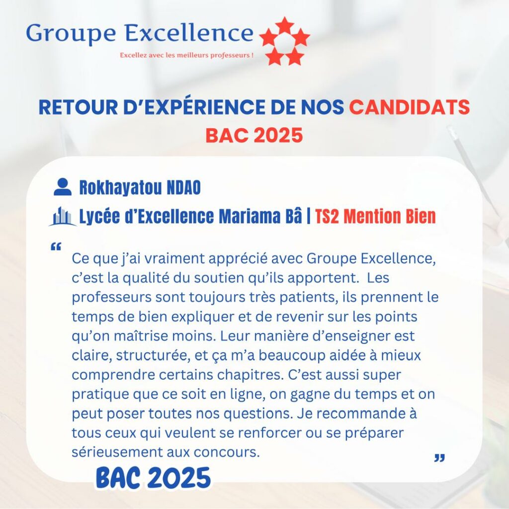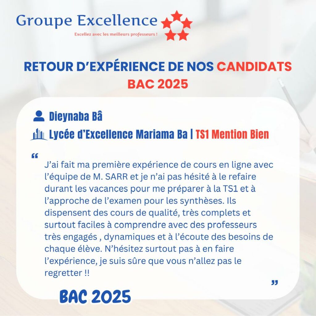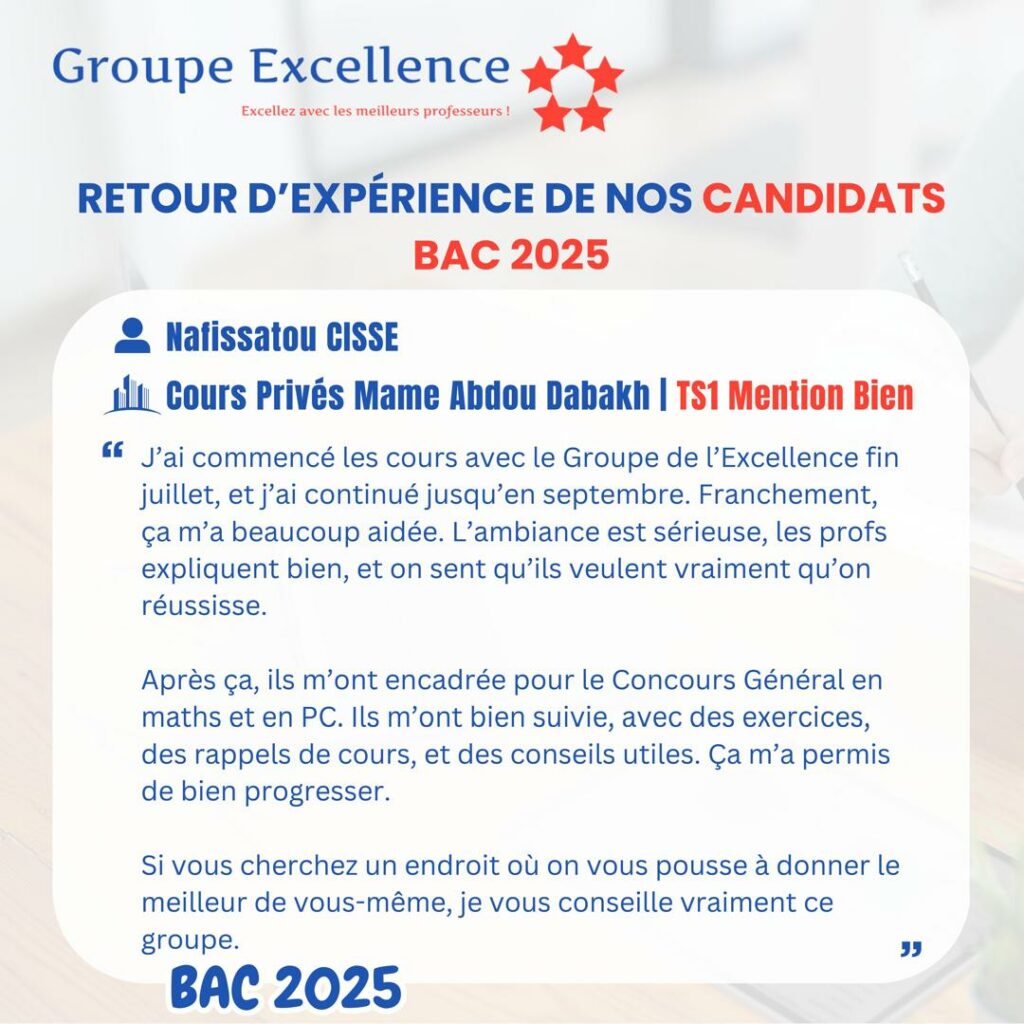 Nos apprenants partagent leur expérience de préparation aux concours d’entrée au Lycée Scientifique d’Excellence de Diourbel (LSED) et aux Lycées Nation-Armée pour la Qualité et l’Équité (LYNAQE), ainsi que l’impact de notre encadrement pédagogique sur leur réussite.